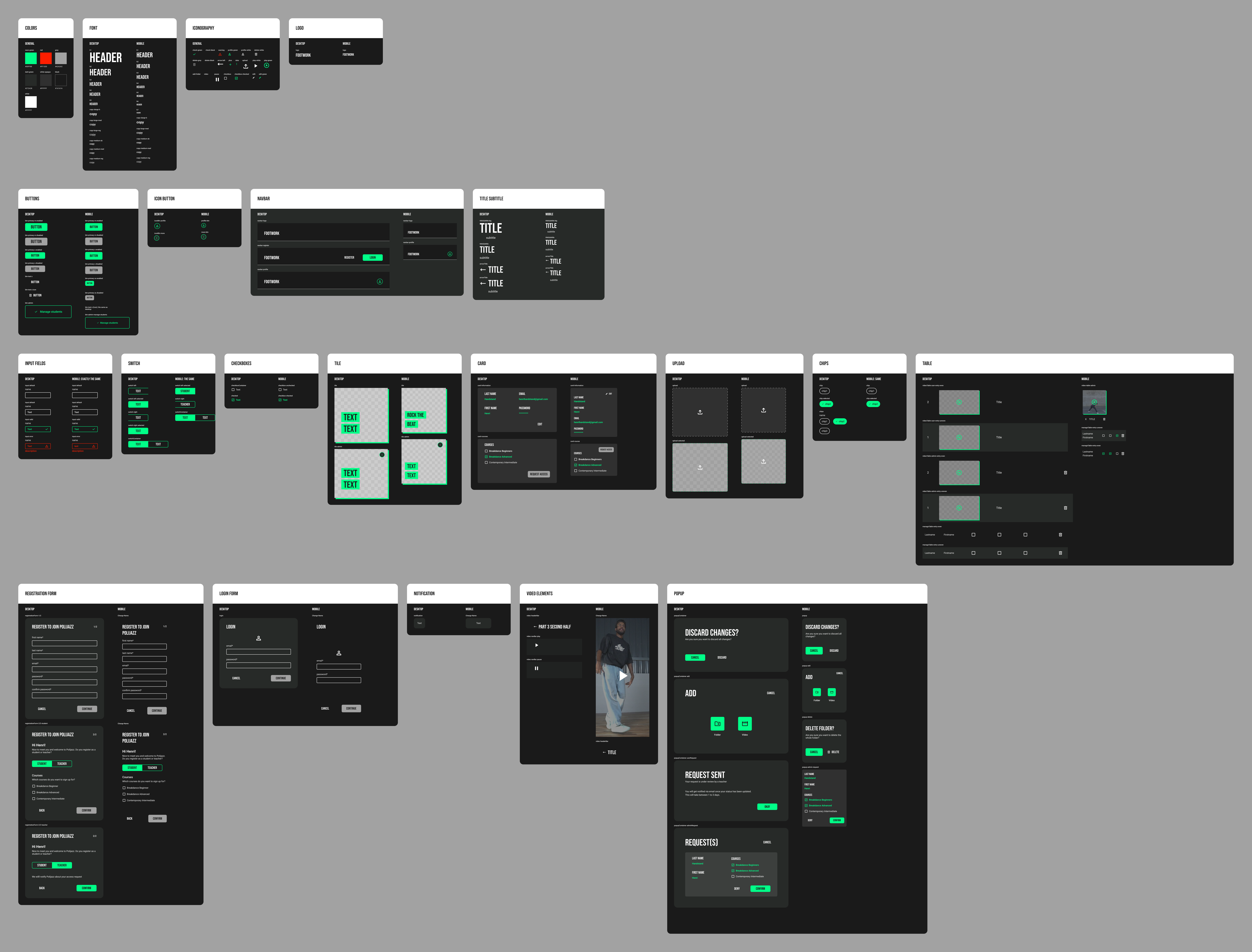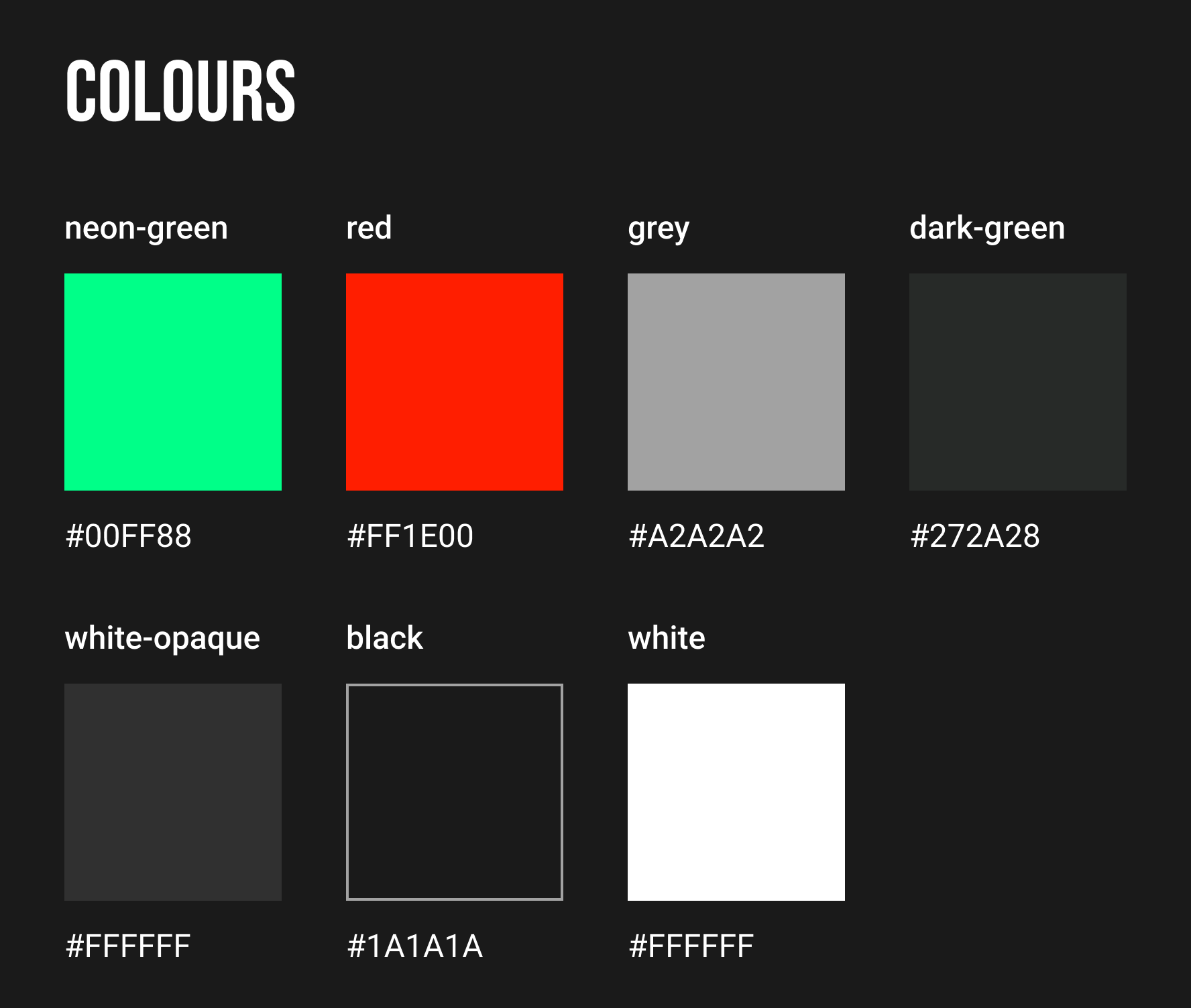 For Footwork's color palette, I chose vibrant and saturated colors that match well with a dark theme. A dark theme fits well for this project as it increases contrast, has a futuristic appearance and creates a good focus on the content.