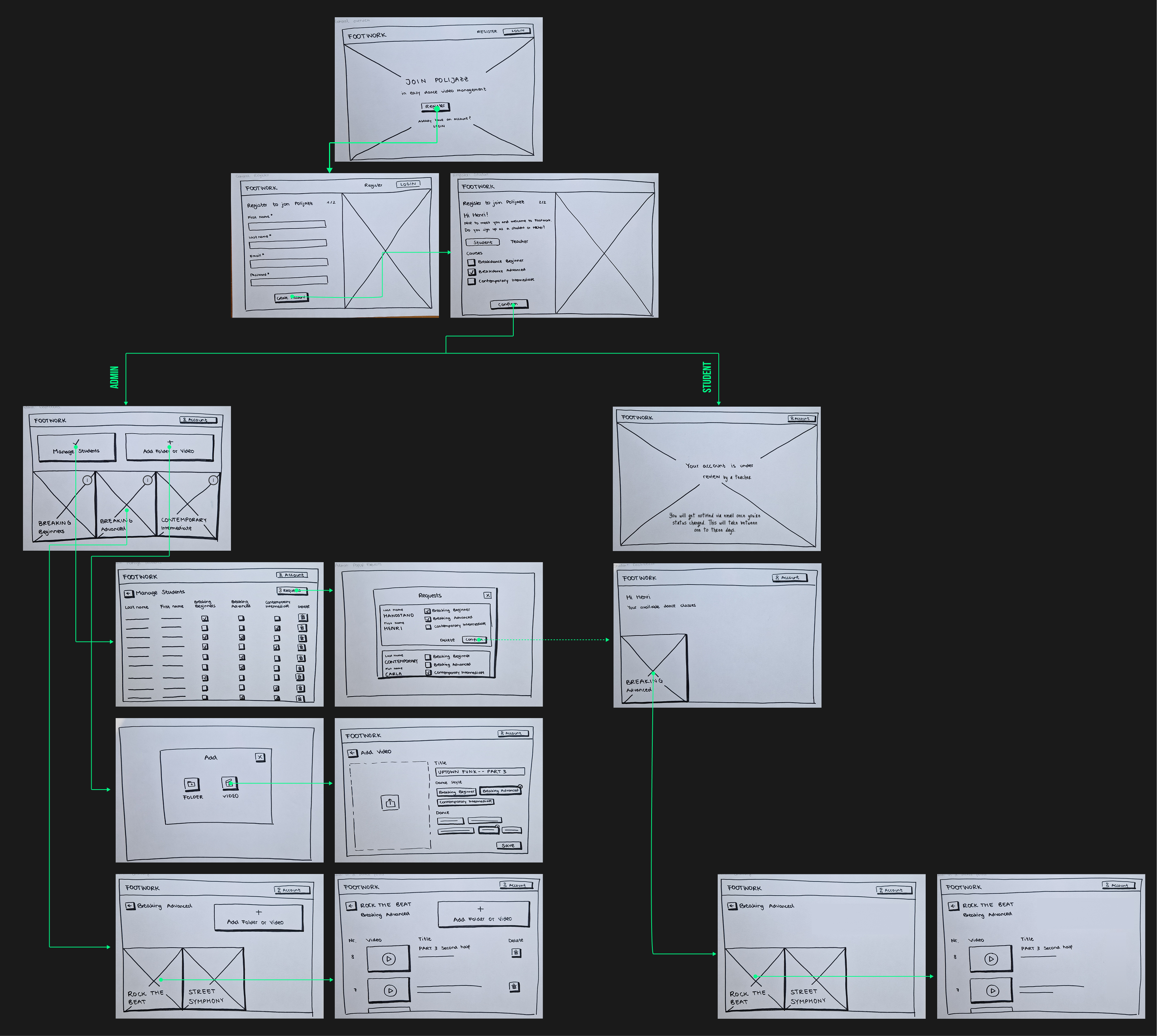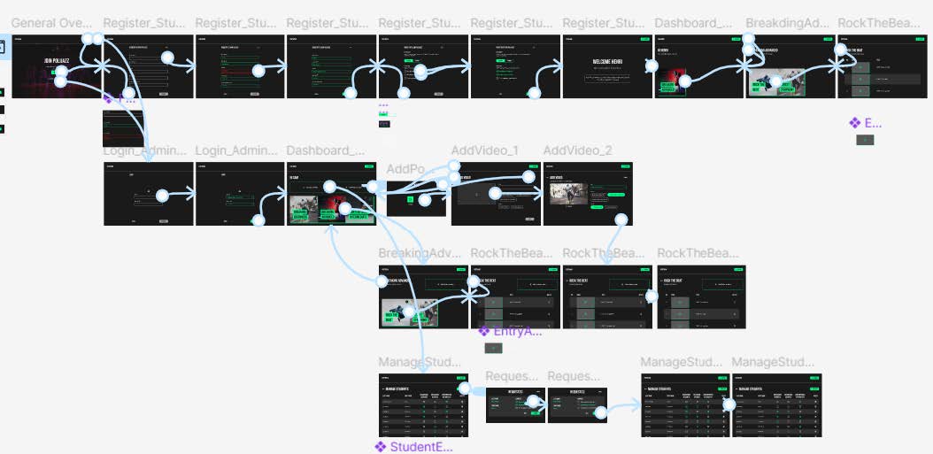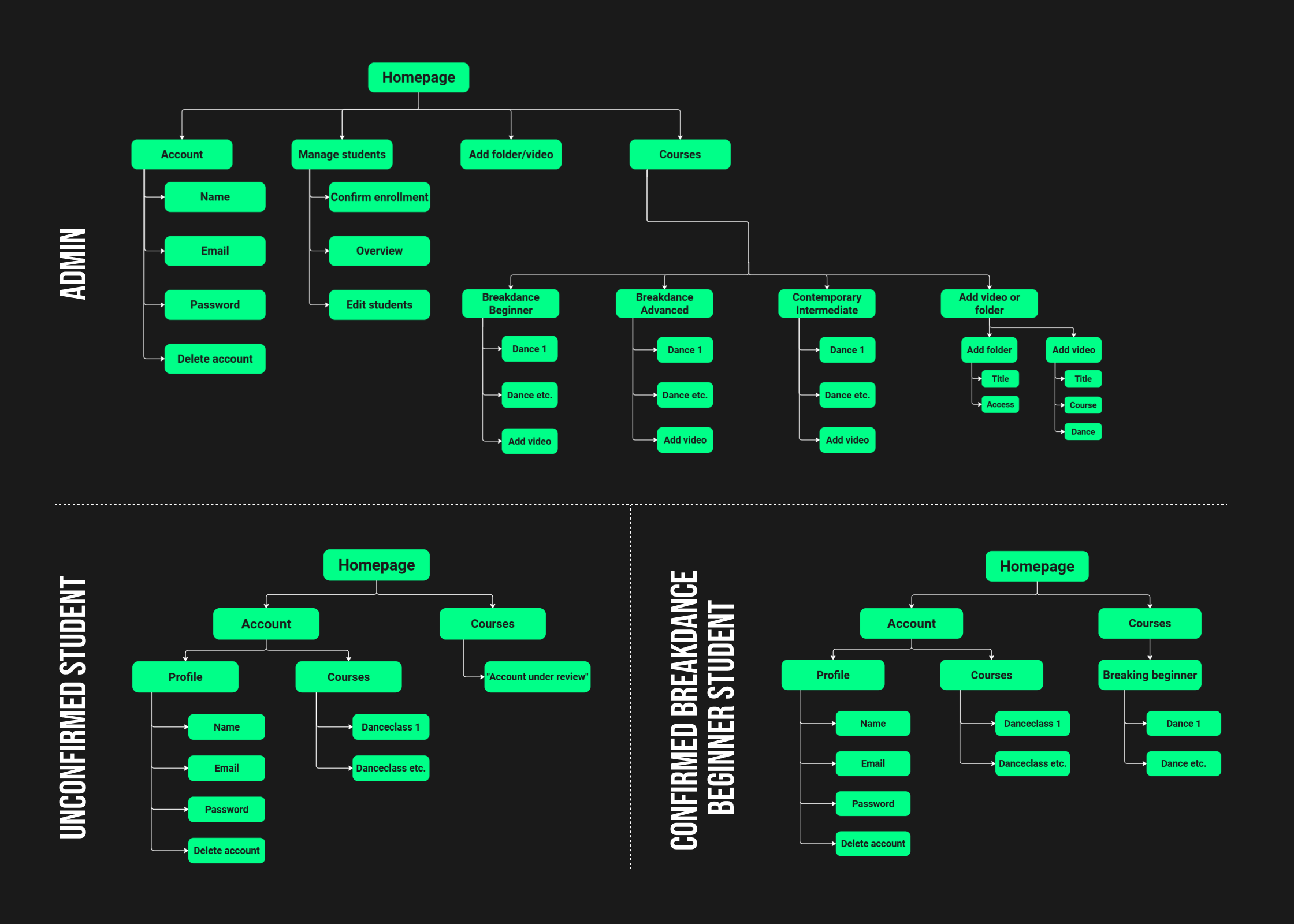 To clarify the structure of the site, we built Information Architectures for three use cases: (1) An admin, (2) an unconfirmed student, and (3) a confirmed breakdance beginner student.