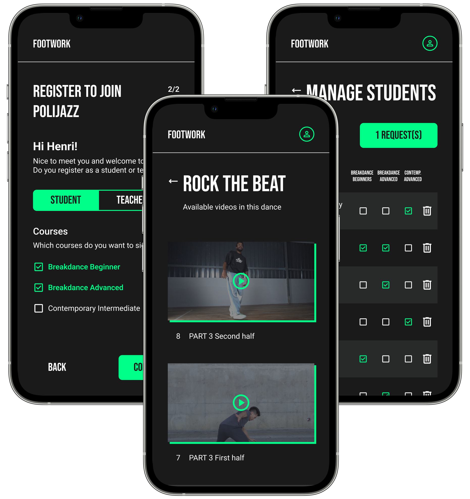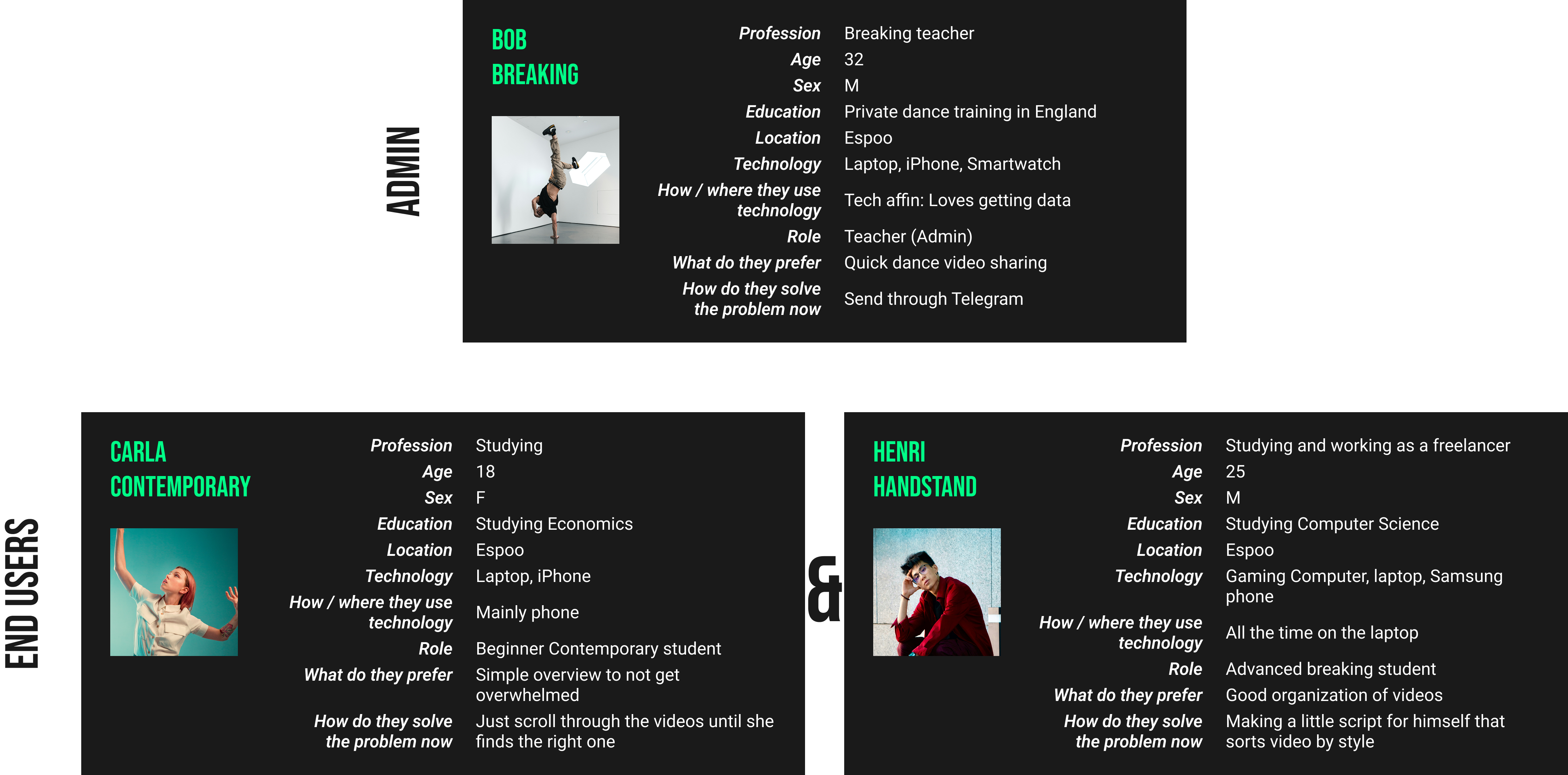 The two user groups getting served with this website are the teachers of dance schools, who get the role of administrators (admin), and dancers, who get the role of end user. For both groups, we created basic personas that help designing with the target group in mind. For the administrator, we created Bob Breaking, as well as two end user personas in the form of Henri Handstand and Carla Contemporary.