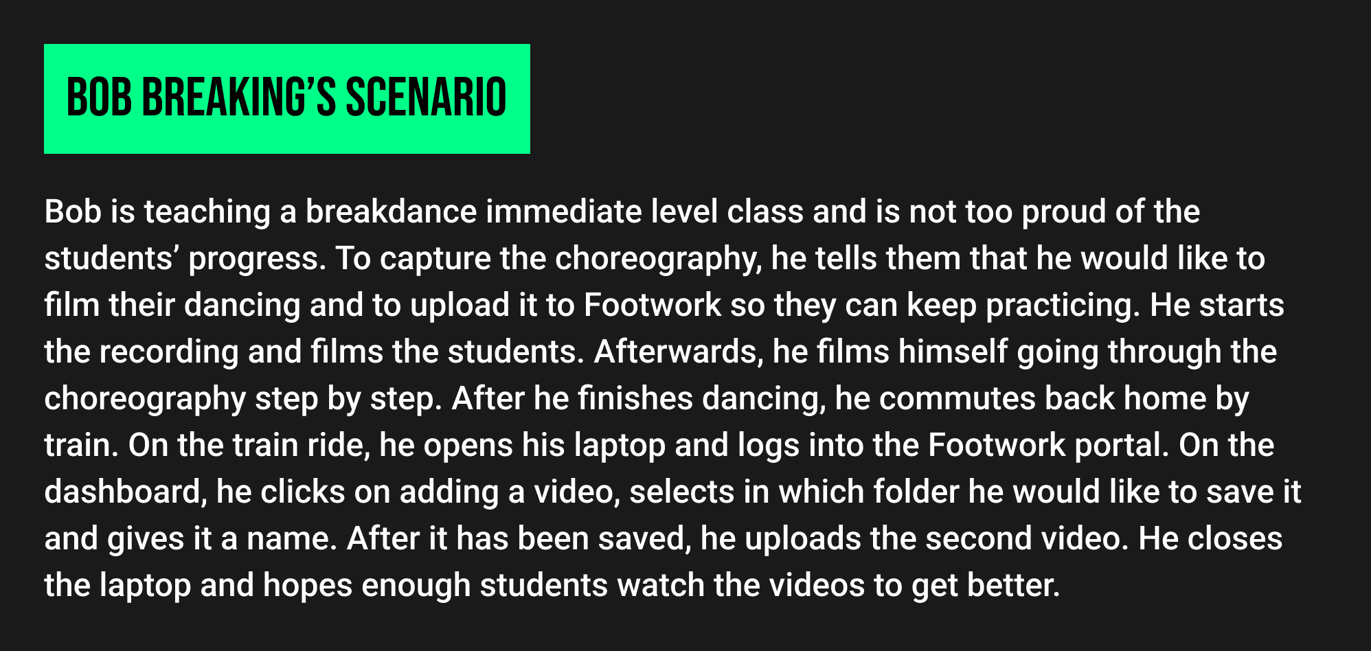 For each of our three personas we developed one important scenario that showcases the need of Footwork and where it can take action to support the student. Bob Breaking's scenario showcases one of the three.